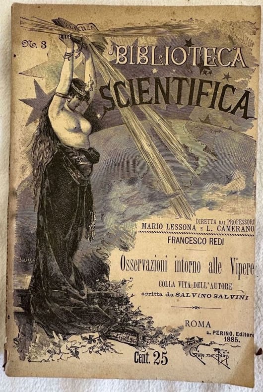 Edizione del 1885 di questa pubblicazione sulle vipere di Francesco Redi (Arezzo 1626 - Pisa 1697) medico, naturalista, e letterato. Opera della collana "Biblioteca scientifica di Mario Lessona e Lorenzo Camerano". All'interno: Vita dell'autore scritta da Salvino Salvini, "Osservazioni intorno alle vipere" di Lorenzo Magalotti, "Sopra alcune opposizioni fatte alle osservazioni intorno alle vipere". In ottime condizioni generali. Copertina editoriale in ottime condizioni con lievi usure marginali. Legatura in buone condizioni. Pagine in ottime condizioni con rare fioriture. In 16. 17x11 cm. Pp. 96.Edition of 1885 of this pamphlet about vipers by Francesco Redi (Arezzo 1626 - Pisa 1697) physician, naturalist and letterate. Work of the series "Biblioteca scientifica di Mario Lessona e Lorenzo Camerano". Life of the author written by Salvino Salvini, "Osservazioni intorno alle vipere" by Lorenzo Magalotti, "Sopra alcune opposizioni fatte alle osservazioni intorno alle vipere". In ottime condizioni generali. Editorial cover in very good conditions lightly worn in the edges. Binding in good conditions. Inside pages are in very good conditions with occasional foxing. In 16. 17x11 cm. Pp. 96.