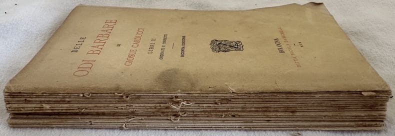 Seconda edizione del 1900 di questa raccolta di poesie del poeta e scrittore Giosuè Carducci (1835-1907). Copertina editoriale originale. In mediocri condizioni Copertina editoriale in mediocri condizioni generali con usure marginali. Piatto posteriore assente. Legatura quasi assente. Pagine in buone condizioni con fioriture. In 16. cm 16,5x10,5. Pp. 230+(2).Second edition of 1900 of this collection of poems by the poet and humanist Giosuè Carducci (1835-1907). Editorial cover. In poor conditions. Editorial cover in poor conditions lightly worn in the extremities. Back plate lacks. Binding almost lacks. Pages in good conditions with foxing. In 16. cm 16,5x10,5. Pp. 230+(2).