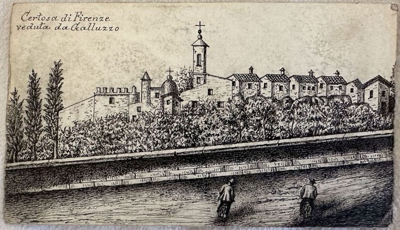 Finissimo disegno a china su carta che rappresenta la Certosa di Firenze vista da Galluzzo, a firma Arcangelo Spira romano disegnatore catastale. Senza data ma della fine dell'ottocento. In ottime condizioni, fioriture In 16. cm. 14,5x8,5.Very fine drawing with china pencil on paper representing Certosa di Firenze from Galluzzo, signed Arcangelo Spira from Rome, drawer of Catasto. Not dated but of late 19th century. In very good conditions, foxing. In 16. cm. 14,5x8,5.