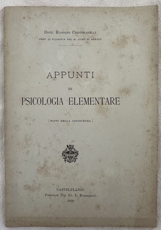 Interessante pubblicazione del 1904 di psicologia scritta dal professore Rodolfo Cristofanelli. Si tratta di una serie di nozioni di psicologia elementare. In ottime condizioni. Brossura editoriale in ottime condizioni generali con lievi usure ai margini e dorso. Legatura in buone condizioni. All'interno le pagine si presentano in ottime condizioni con rare fioriture. In 8. cm 21x14,5. Pp. 86.Interesting pamphlet of 1904 of psychology written by the teacher Rodolfo Cristofanelli. It is a series of notions of elementary psychology. In very good conditions. Editorial cover in very good general conditions lightly worn in the extremities. Binding in good conditions. Inside pages are in very good conditions with occasional foxing.In 8. cm 21x14,5. Pp. 86.