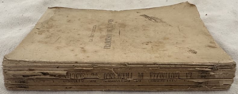 Prima edizione del 1889 di questa opera autobiografica del critico letterario, saggista e politico Francesco Saverio de Sanctis (Morra Irpina 1817-Napoli 1883) pubblicato a cura di Pasquale Villari De Sanctis è considerato uno dei maggiori critici e storici della letteratura italiana nel XIX secolo. Firma al frontespizio. In discrete condizioni. Copertina in mediocri condizioni con usure marginali. Piatto anteriore assente. Legatura quasi assente. Pagine in buone condizioni con fioriture. In 16. 18,5x12,5 cm. Pp. 386.First edition of 1889 of this autobiographical work by the critic, essayer and politician Francesco Saverio de Sanctis (Morra Irpina 1817-Napoli 1883) published by Pasquale Villari. De Sanctis is considered one of the most famous critics and historian of italian literature of 19th century. Signature in the title page. In fair conditions. Cover in poor conditions lightly worn in the extremities. Front plate lacks,. Binding almost lacks. Inside pages are in good conditions with foxing. In 16. 18,5x12,5 cm. Pp. 386