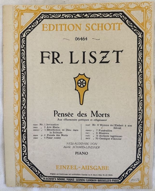 Edizione del 1917 della melodia "Pensee des morts" di Franz Liszt (1811-1886) riveduto da Aug. Schmid Lindner.<BR><BR>Illustrazione in copertina.<BR><BR>In ottime condizioni.<BR><BR>Copertina editoriale in ottime condizioni con lievi usure marginali. Legatura in buone condizioni. Pagine in ottime condizioni con rare fioriture. In Folio. cm. 31x25. Pp. 11.Edition of 1917 of the melody "Pensee des morts" by Franz Liszt (1811-1886) reviewed by Aug. Schmid Lindner.<BR><BR>Illustration in the cover.<BR><BR>In very good conditions.<BR><BR>Editorial cover in very good conditions lightly worn in the extremities. Binding in good conditions. Pages in very good conditions with occasional foxing. In Folio. cm. 31x25. Pp. 11.