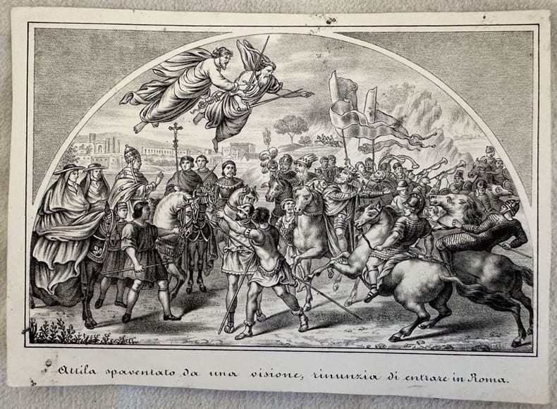 Litografia che mostra un momento storico: Attila che rinuncia ad entrare a Roma Autore: anonimo Data: 1850 circa Tecnica: litografia Dimensione del foglio: 165x117 mm Dimensione incisione: 156x102 mm Condizioni: Ottime. Alcune fioriture. Beautiful lythography representing an hystorical moment: Attila renouciates to enter in Rome Author: anonymous Date: 1850 circa Technique: lithography Page size: 165x117 mm Engraving size: 156x102 mm Conditions: Very good conditions. Some foxing.