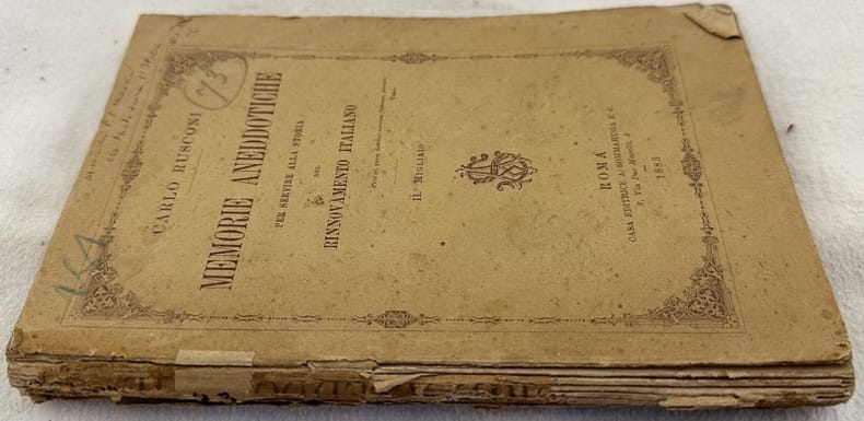 Prima edizione del 1883, secondo migliaio, di questa opera sul Risorgimento scritta da Carlo Rusconi. Dedica dell'autore in copertina al Ministro Pasquale Stanislao Mancini (Castel Baronia 1817- Napoli 1888) avvocato, giurista e politico. Tra gli argomenti trattati: La rivoluzione di Bologna del 1831, Giovanni Vicini, Paolo Costa, Bonelli, Tognetti e Modena, Il Generale Armandi, Mazzini e Buonarroti, Minghetti, Balbo, Niccolini, Il Cardinale Antonelli, Guerrazzi, Il padre Ventura, Novara e il Ministro degli esteri a Roima, Lorenzo Valerio, Lord Minto, Lord Beaumont, Riccardo Cobden, Pittore Morelli, Ledru Rollin, Frapolli, Montanelli, Madama Sand, Vescovo di Worcester, Lord Darnley, Macon e il poeta Lamartine, Felcie Orsini, Torino, Pier Dionigi Pinelli, Alberto Mario, Aleardo Aleardi, Pietro Maestri, Carlo Mayr, Salvatore Anau, Mauro Macchi, Il General Medici, Costantino Cernuschi, Agostino Bertant, Il Dottor Conenau, il banchetto della via di Lilla, Arago Girardin Carnot Favre Beranger Quinet Blanc, Il Principe Napoleone Girolamo ec.. In discrete condizioni. Copertina editoriale in discrete condizioni generali con lievi usure ai margini e dorso. Piatto posteriore staccato. Legatura in discrete condizioni. All'interno le pagine si presentano in buone condizioni con fioriture. In 16. Dim. 18,5x12,5 cm. Pp. 155+(5).First edition of 1883, second thousand, of this work about Risorgimento period written by Carlo Rusconi. Dedication of the author in the cover to the Ministery Pasquale Stanislao Mancini (Castel Baronia 1817- Napoli 1888) lawyer jurist and politician. The issues treated: La rivoluzione di Bologna del 1831, Giovanni Vicini, Paolo Costa, Bonelli, Tognetti e Modena, Il Generale Armandi, Mazzini e Buonarroti, Minghetti, Balbo, Niccolini, Il Cardinale Antonelli, Guerrazzi, Il padre Ventura, Novara e il Ministro degli esteri a Roima, Lorenzo Valerio, Lord Minto, Lord Beaumont, Riccardo Cobden, Pittore Morelli, Ledru Rollin, Frapolli, Montanelli, Madama Sand, Vescovo di Worcester, Lord Darnley, Macon e il poeta Lamartine, Felcie Orsini, Torino, Pier Dionigi Pinelli, Alberto Mario, Aleardo Aleardi, Pietro Maestri, Carlo Mayr, Salvatore Anau, Mauro Macchi, Il General Medici, Costantino Cernuschi, Agostino Bertant, Il Dottor Conenau, il banchetto della via di Lilla, Arago Girardin Carnot Favre Beranger Quinet Blanc, Il Principe Napoleone Girolamo ec.. In fair conditions. Editorial cover in fair general conditions lightly worn in the extremities. Back plate is detached. Binding in fair conditions. Inside pages are in good conditions with foxing. In 16. Dim. 18,5x12,5 cm. Pp. 155+(5).<BR><BR>