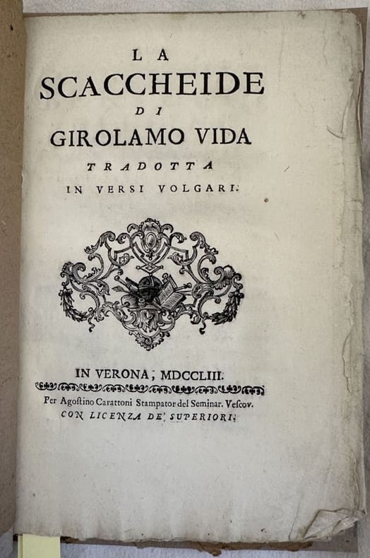 Bella edizione del 1753 di questa operetta di Marco Gerolamo Vida (1485-1566) umanista poeta e vescovo cattolico. L'opera è un poemetto didascalico sul gioco degli scacchi originariamente scritto in lingua latina. Traduzione a cura di Carlo Pindemonte che dedica l'opera a Bertucci Delfino. La prima versione in lingua italiana dello Scacchia ludo, poemetto dedicato al gioco degli scacchi e dato per la prima alle stampe nel 1537, all'interno dell'edizione apparsa a Basilea degli Opera del vescovo di Adria Vida Vida (1485-1566). Lineamenti di una bibl. italiana degli Scacchi (867). In barbe. In buone condizioni. Copertina morbida con titolo al piatto anteriore in buone condizioni generali. Legatura in buone condizioni. All'interno le pagine si presentano in ottime condizioni con rare fioriture. In 8. Dim. 23x15,5 cm. Pp. XLII+(1). Beautiful edition of 1753 of this work by Marco Gerolamo Vida (1485-1566) humanist poet and byshop. The work is a didascalic poem about thw game of chess originally written in latin language. Translation by Carlo Pindemonti who dedicates the work to Bertucci Delfino. the first version in italian language of Scacchia ludo, little pome dedicated to chess game and poublished for the first time in 1537, in the edition of Basilea degli Opera of byshop of Adria Vida Vida (1485-1566). Lineamenti di una bibl. italiana degli Scacchi (867). Uncut copy. In good conditions. Soft cover with title in the front plate in good conditions. Binding in good conditions. Pages in very good conditions with occasional foxing. In 8. Dim. 23x15,5 cm. Pp. XLII+(1). <BR><BR>