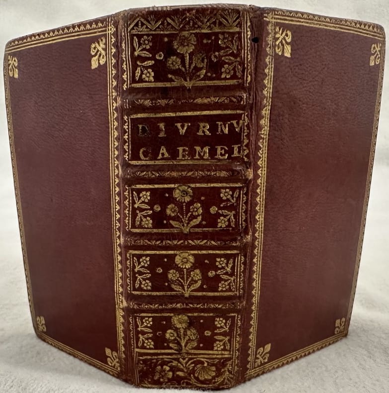 Rarissima opera liturgica del 1693, un diurno dell'Ordine dei fratelli della Beata Vergine del Monte Carmelo. Le origini del rito carmelitano risalgono alla liturgia gallicano-romana portato in Terra Santa dai crociati. Venne rinnovato nel 1312 dal carmelitano tedesco Siberto di Beka fino al 1956 quando la Santa Sede impose all'ordine di scegliere definitivamente tra rito romano e carmelitano. Dal 1972 l'ordine utilizza il Rito Romano. Frontespizio figurato e sette finissime incisioni a piena pagina impreziosiscono il testo tra cui l'annunciazione, la natività, l'arrivo dei Re Magi, la Resurrezione, I Santi, La Beata Vergine del Monte Carmelo. Alla fine del volume tredici fogli bianchi. Antica nota manoscritta alla prima carta bianca. Sguardie marmorizzate. In ottime condizioni. Copertina in marocchino rosso coeva con titolo e ricche decorazioni in oro al dorso e piatti n ottime condizioni generali con lievi usure marginali. Legatura in buone condizioni. All'interno le pagine si presentano in buone condizioni con rare fioriture. In 32. Dim. 10x6x3,5 cm. Pp. (8)+416. Peso gr. 150.Very scarce liturgical work of 1693, a diurnum of the Ordine dei fratelli della Beata Vergine del Monte Carmelo. The origins of carmelitan rhyte belongs to gallican roman liturgy and the rhyte was renewed in 1312 byt he german carmilitan Siberto di Beka until 1956 when the Santa Sede imposed to the Order to choose definetevely between carmilitan and roman rhyte. From 1972 the order uses roman rhyte. Figurated title page and seven full page very fine engravings enrich the text. Between them the annunciarion, naticity, arrival of Re Magi, resurrections, Saints, The Blessed Virgin of Mount Carmelo. At the end of the volume there are 13 blank pages. Antique handwritten note in the first endpage. Marbled counterplates. In very good conditions. Red morocco coeval cover with gilted title in the spine and rich gilted decorations in very good general conditions lightly worn and lackings in the extremities. Binding in good conditions. Inside pages are in good conditions with occasional foxing. Pages from 179 and 181 have been bound in the contrary.In 32. Dim. 10x6x3,5 cm. Pp. (8)+416. Peso gr. 150.