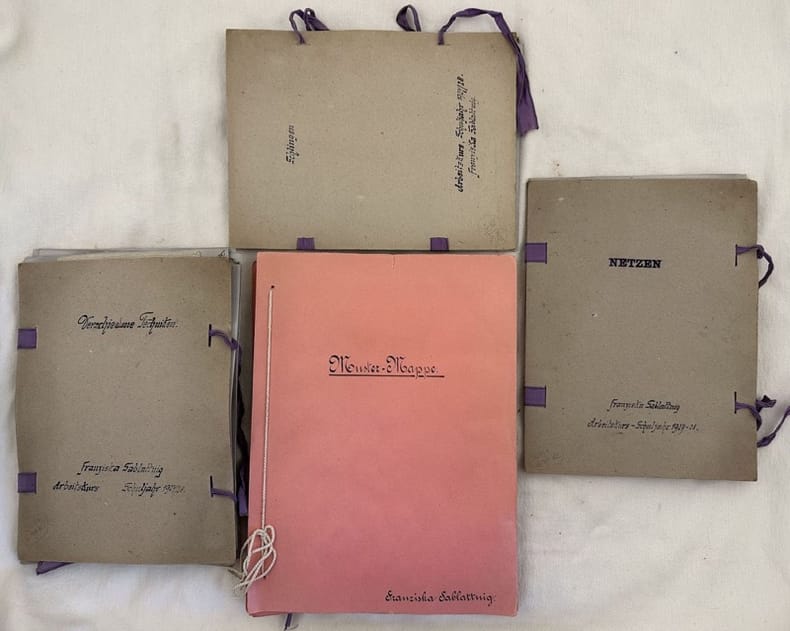 Bellissima raccolta di circa 158 modelli di ricamo e maglia della studentessa Franziska Sablattnig eseguiti per il corso di economia domestica nel periodo scolastico 1924-28. Provenienza Austria. Le prove di ricamo, maglia, macrame, crochet, punto croce, uncinetto sono state fissate su cartoncini e raccolte in quattro raccoglitori. Sono presenti diversi centrini di piccole dimensioni (all'incirca della misura di un sottobicchiere) In ottime condizioni. Dim. 33,5x25 cm, 28x21 cm. Very beautfitul collection of circa 158 models of embroidery and knitting of the student Franziska Sablattnig made for the course of house management during the periodì 1924-28. Provenance Austria. The proofs of embroidery, knitting, macrame, crochet, netting have been fixed in carton boards and collected in four cases There are some doilies of little size (about the size of a under glass) In very good conditions. Dim. 33,5x25 cm, 28x21 cm.