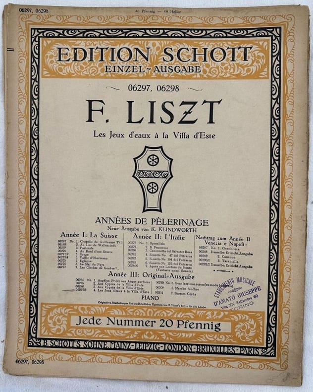 Edizione di inizio novecento della melodia "Les jeux d'eaux à la Villa D'Este" di Franz Liszt (1811-1886) di pianoforte. Decorazioni in copertina. In discrete condizioni. Copertina editoriale in discrete condizioni con lievi usure marginali. Piatti staccati. Legatura editorialmente assente. Pagine in buone condizioni con rare fioriture. In Folio. cm. 33,5x27,5. Pp. 15.Edition of early 20th century of the melody "Les jeux d'eaux à la Villa D'Este" by Franz Liszt (1811-1886). Decorations in the cover. In fair conditions. Editorial cover in fair conditions lightly worn in the extremities. Plates are detached. Binding editoriarly lacks. Pages in good conditions with occasional foxing. In Folio. cm. 33,5x27,5. Pp. 15.