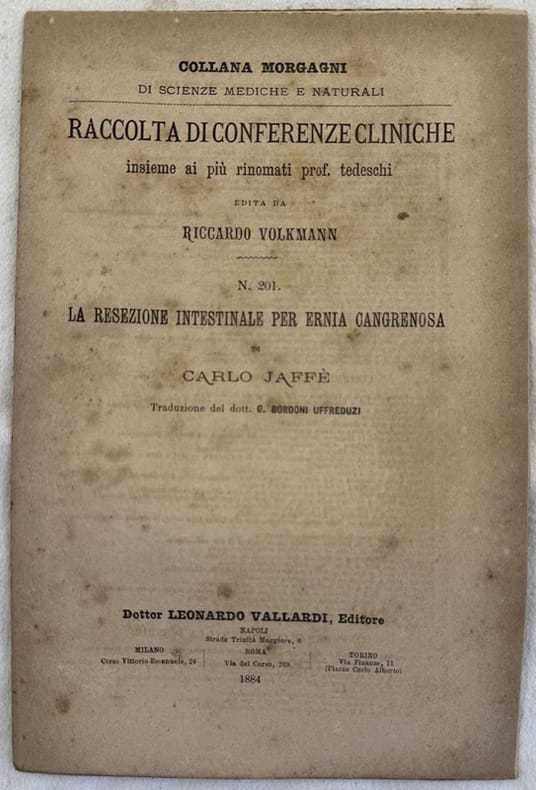 Interessante pubblicazione del 1884, la resezione intestinale per ernia cangrenosa a cura di Carlo Jaffè. Traduzione del Dottor G. Bordoni Uffreduzi. Fascicolo della Collana Morgagni di scienze mediche e naturali. In ottime condizioni. Copertina editoriale in ottime condizioni generali con lievi usure ai margini e dorso. Legatura in buone condizioni. Pagine in ottime condizioni con rare fioriture. In 8. cm. 25x16,5. Pp. 2201-2217.Interesting pamphlet of 1884, the intestinal resection by Carlo Jaffè. Translation by G. Bordoni Uffreduzi. Pamphlet of Collana Morgagni of natural and medical science. In very good conditions. Editorial cover in very good conditions lightly worn in the extremities. Binding in good conditions. Pages in very good conditions with occasional foxing. In 8. cm. 25x16,5. Pp. 2201-2217.