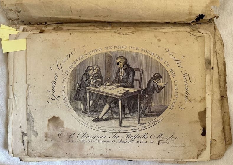 Rarissima opera di calligrafia dell'incisore Gaetano Giarrè attivo a Firenze dal 1795 al 1825 circa. Senza data ma del 1808 come riportato in calce alla tavola 10. La raccolta è composta da 17 tavole incise ed è completa. In fine sono state rilegate tre tavole (n. 10, 12, 13) non appartenenti a questa opera, Le tavole mostrano una serie di modelli di scrittura (alfabeto corsivo all'italiana, carattere inglese, alfabeto minuscolo, metodo pendente per acquisire un ugual distanza, carattere formato all'italiana, portamento corretto ec..). In discrete condizioni, tracce d'uso e note manoscritte. Copertina morbida coeva con titolo manoscritto in mediocri condizioni generali con usure, parti mancanti e macchie. Legatura quasi assente, la gran parte delle tavole sono sciolte. All'interno le pagine si presentano in discrete condizioni con fioriture e macchie. In 4. Dim. 28,5x20,5 cm. Pp. (1)+17+3.Very scarce work of calligraphy by the engraver Gaetano Giarrè active in Florence from 1795 to 1825 circa. Not dated but of 1808 as indicated in the foot of page 10. The collection is made up of 17 engraved plates and it si complete. At the end there are thre plates (n. 10, 12, 13) not belonging to this work The plates show a seriues of models of writing (alfabeto corsivo all'italiana, carattere inglese, alfabeto minuscolo, metodo pendente per acquisire un ugual distanza, carattere formato all'italiana, portamento corretto ec..). In fair conditions, wearings signas and handwritten notes. Softcoeval cover with handwritten title in poor general conditions with wearings. Binding almost lacks, the greatest part of plates are loose. Inside pages are in fair conditions with foxing and stains. In 4. Dim. 28,5x20,5 cm. Pp. (1)+17+3.
