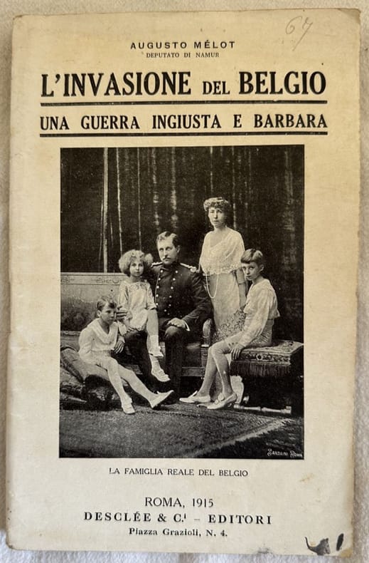 Interessante pubblicazione del 1915 sull'invasione del Belgio durante la grande guerra scritto da Augusto Melot. All'interno: La guerra ingiusta, La guerra barbara (il codice tedesco della guerra, i proclami del terrore, i giornali di guerra tedeschi e la legegnda dei franchi tiratori, Il martirio del clero belga, preti assassinati), Preti oltraggiati e maltrattati (il sacco di Lovanio, Chiese profanate, il trattamento fatto ai vescovi, le cause dei delitti, il Belgio fa il suo dovere continuando a resistere, Per la civiltà contro le barbarie! ec.. In ottime condizioni. Copertina editoriale in ottime condizioni generali con lievi usure ai margini e dorso. Legatura in buone condizioni. Pagine in ottime condizioni con rare fioriture. In 16. cm. 18x11,5. Pp. 62+(2).Interesting pamphlet of 1915 about the invasion of Belgium during the World War written by Augusto Melot. In very good conditions Editorial cover in very good conditions lightly worn in the extremities. Binding in good conditions. Pages in very good conditions with occasional foxing. In 16. cm. 18x11,5. Pp. 62+(2).
