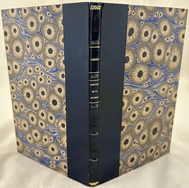 Rarissima pubblicazione senza data ma del 1847 sulla storia della dolomia scritta dal geologo e metallurgico francese Joseph Jean Baptiste Xavier Fournet (1801-1869). Professore all'Università di geologia di Lione, pubblicò numerose memorie e pubblicazioni di chimica e mineralogia. Alcune illustrazioni nel testo e alla fine due tavole fuori testo. Ex libris al contropiatto anteriore. In ottime condizioni. Copertina in mezza pelle con titolo e decorazioni in oro al dorso in ottime condizioni generali con lievi usure ai margini e dorso. Legatura in buone condizioni. Pagine in ottime condizioni con rare fioriture. In 4. cm 27x19,5. Pp. (1)+136+2 tav. Peso Kg. 0,350. Very scarce pamphlet not dated but of 1847 circa about the history of dolomia written by the french geologist and metallurgist Joseph Jean Baptiste Xavier Fournet (1801-1869). He was teacher in the University of Lione and published different memories and pamphlets of geology and mineralogy. Some illustrations in the text and two out of text plates in the end of the volume. Ex libris in the front counterplate. In very good conditions. Half leather coeval cover with gilted title and decorations in the spine in very good general conditions lightly worn in the extremities. Binding in good conditions. Pages in very good conditions with occasional foxing. In 4. cm 27x19,5. Pp. (1)+136+2 tav. Peso Kg. 0,350. <BR><BR>
