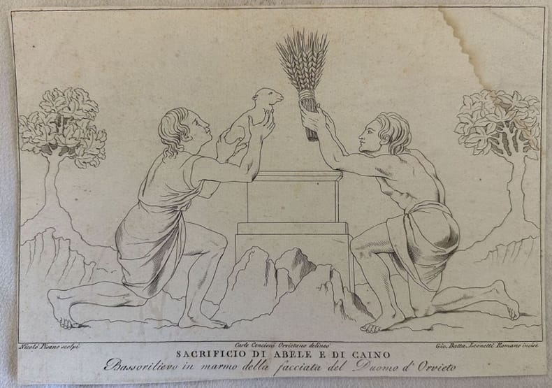 Bella incisione all'acquaforte che riproduce il bassorilievo in marmo della facciata del Duomo di Orvieto "Sacrificio di Abele e di Caino". Incisione appartenente alla serie "Stampe del duomo di Orvieto". Margini eccessivamente rifilati. Data: 1790 circa Autore: Giovanni Battista Leonetti (1791-1808) su disegno di Carlo Cencioni (1770 ca-1827). Scultura di Nicola Pisano (1220 ca-ante 1284) Tecnica:acquaforte Dimensione del foglio: 168x236 mm Dimensione dell'incisione: 150x235 mm Condizioni: Buone. Alcune fioriture e gore. Beautiful etching reproducing the basrelief in th4e facade of the Dome of Orvieto "Sacrificio di Abele e di Caino". Engraving belonging to the series "Stampe del duomo di Orvieto". Edgees are excessively cut. Date: 1790 circa Autore: Giovanni Battista Leonetti (1791-1808) after Carlo Cencioni (1770 ca-1827). Sculpture by Nicola Pisano (1220 ca-ante 1284) Technique: etching Size of the page: 168x236 mm Size of the engraving: 150x235 mm Conditions: Good. Some foxing and dump stains