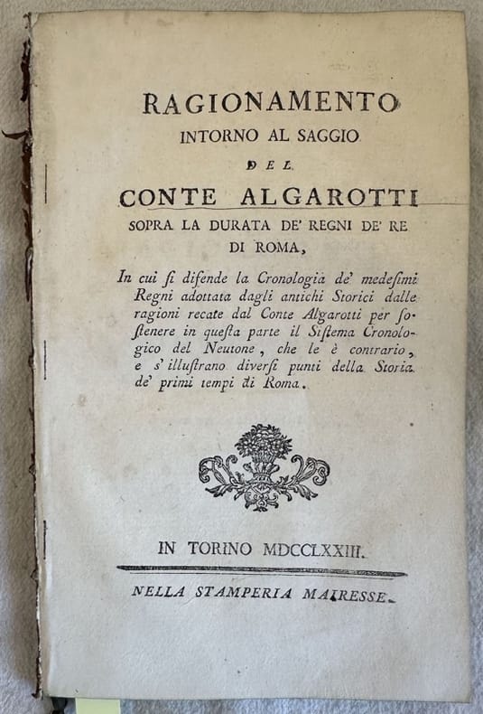 Edizione del 1773 di questo interessante trattato storico sul saggio del Conte Algarotti sulla durata dei regni dei Re di Roma. Autore anonimo ma dell'intellettuale piemontese Gianfrancesco Galeani Napione (1748-1830) (Cfr. Melzi, Dizionario di opere anonime e pseudonime, v. 2, p. 406). In buone condizioni. Copertina assente. Legatura in buone condizioni. All'interno le pagine si presentano in buone condizioni con rare fioriture. In 8. Dim. 20x12,5 cm. Pp. (2)+150. Edition of 1773 of this interesting hystorical treaty about the essay of Conte Algarotti about the lenght of Kings of Kings of Rome. Anonymous author but of the intellectual from Piedmont Gianfrancesco Galeani Napione (1748-1830) (Cfr. Melzi, Dizionario di opere anonime e pseudonime, v. 2, p. 406). In good conditions. Cover lacks. Binding in good conditions. Pages in good conditions with occasional foxing. In 8. Dim. 20x12,5 cm. Pp. (2)+150.