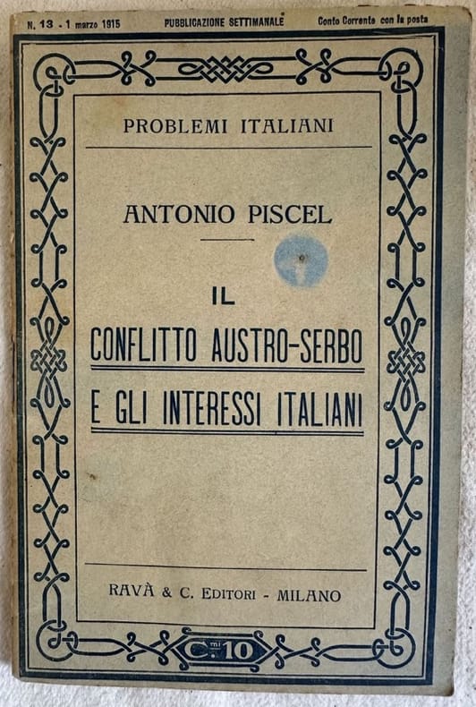 Interessante pubblicazione del 1915 sul Conflitto austro-serbo e gli interessi italiani scritto da Antonio Piscel della collana "Problemi italiani". All'interno: Il risorgimento della nazione serba, Risveglio nazionale degli slavi meridionali, trasformazione economica e sociale nella Jugoslavia, pressione slava e resistenza italiana, organizzazione del nazionalismo serbo, il partito militare austriaco, l'esercito austriaco e i dissidi austro ungarici, magiari e tedeschi contro il trialismo, processi politici e falsificazioni della Polizia, L'annessione della Bosnia, La guerra balcanica ecc.. In ottime condizioni. Copertina editoriale in ottime condizioni generali con lievi usure ai margini e dorso. Legatura in buone condizioni. Pagine in ottime condizioni con rare fioriture. In 16. cm 17x11,5. Pp. 32. Interesting pamphlet of 1915 about the Riot austro-serbo and italian interests written by Antonio Piscel of the series "Problemi italiani". Inside: Il risorgimento della nazione serba, Risveglio nazionale degli slavi meridionali, trasformazione economica e sociale nella Jugoslavia, pressione slava e resistenza italiana, organizzazione del nazionalismo serbo, il partito militare austriaco, l'esercito austriaco e i dissidi austro ungarici, magiari e tedeschi contro il trialismo, processi politici e falsificazioni della Polizia, L'annessione della Bosnia, La guerra balcanica ecc.. In very good conditions. Editorial cover in very good conditions lightly worn in the extremities. Binding in good conditions. Pages in very good conditions with occasional foxing. In 16. cm 17x11,5. Pp. 32.