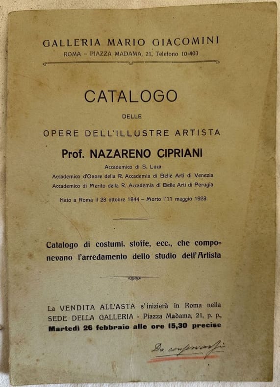 Catalogo del 1924 della Galleria Mario Giacomini per la vendita all'asta delle opere di Nazareno Cipriani (Roma 1844-1923). Alla fine del volume un foglio anticamente manoscritto con la lista delle opere possedute dall proprietario della pubblicazione. In buone condizioni. Copertina editoriale in buone condizioni generali con lievi usure marginali. Legatura in buone condizioni. Pagine in buone condizioni con rare fioriture. Piegatura verticale. In 8. cm. 24,5x17,5. Pp. 19.Catalogue of 1924 of the Gallery Mario Giacomini for the auction selling of the works of Nazareno Cipriani (Roma 1844-1923). Att he end of the volume a page anciently handwritten with the list of the works owned by the owner of the pamphlet. In good conditions. Editorial cover in good conditions lightly worn in the extremities. Binding in good conditions. Pages in good conditions with occasional foxing. Vertical folding. In 8. cm. 24,5x17,5. Pp. 19.