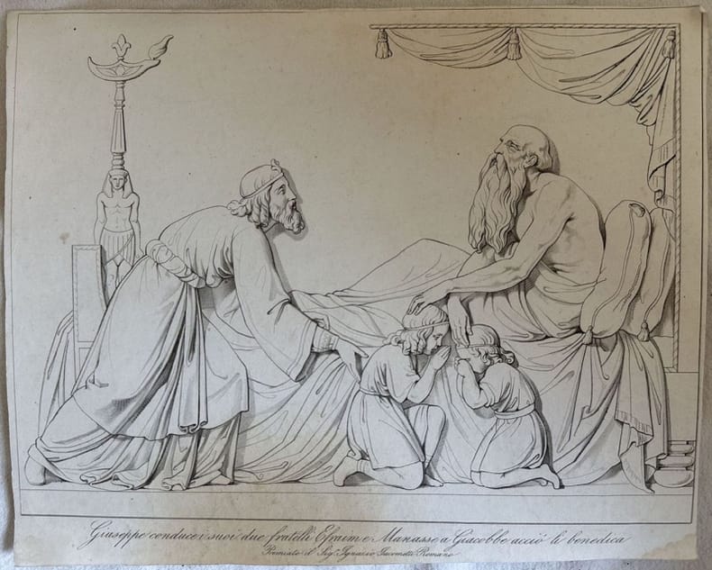Bella acquaforte che mostra una scena biblica la benedizione dei fratelli Efraim e Manasse a Giacobbe. Data: 1839/40 circa Tecnica: acquaforte Dimensione del foglio: 23,5x29 cm Dimensione dell'incisione: 21,5x28,5 cm Condizioni: Buone. Alcune fioriture Nice etching showing a bible scene the blessing of brothers Efraim and Manasse to Giacobbe. Date: 1839/40 circa Technique: etching Size of the page: 23,5x29 cm Size of the engraving: 21,5x28,5 cm Conditions: Good conditions. Some foxing