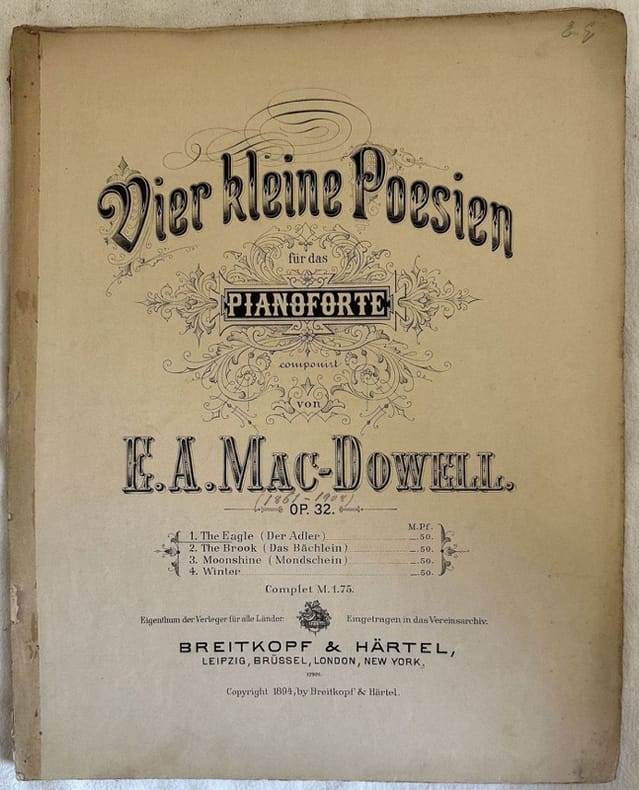 Edizione del 1894 dell'opera 32 per pianoforte del compositore americano Edward MacDowell (1860-1908). In discrete condizioni. Copertina editoriale in discrete condizioni con lievi usure marginali. Dorso coperto da carta. Legatura quasi assente. Pagine in buone condizioni con rare fioriture. In 4. cm. 34,5x27,5. Pp. 3+3+3+3.Edition of 1894 of the opera 32 for piano by the american composer Edward MacDowell (1860-1908). n fair conditions. Editorial cover in fair conditions lightly worn in the extremities. Spine covered by paper. Binding almost lacks. Pages in good conditions with occasional foxing. In 4. cm. 34,5x27,5. Pp. 3+3+3+3.<BR><BR>