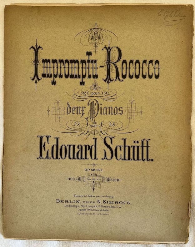 Edizione del 1899 dell'opera 58 numero due, la melodia "Impromptu Rococco" per pianoforte a quattro mani del compositore e pianista russo Eduard Schutt (1856-1933). Sono presenti due copie, una per ogni pianista. In discrete condizioni. Copertina editoriale in discrete condizioni con lievi usure marginali. Piatti staccati in una copia. Legatura quasi assente. Pagine in buone condizioni con rare fioriture. In folio. cm. 34,5x27. Pp. 15, 15.Edition of 1899 of the opera 58 number two, the melody "Impromptu Rococco" for piano four hands by the russian composer and piano player Eduard Schutt (1856-1933). there are two copy, one for each piano player. In fair conditions. Editorial cover in fair conditions lightly worn in the extremities. one copy with plates detached. Binding almost lacks. Pages in good conditions with occasional foxing. In folio. cm. 34,5x27. Pp. 15, 15.