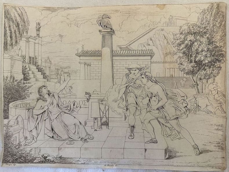 Bella scena mitologica del 1840 circa incisa da Filippo Cartoni attivo a Roma nella prima metà del XIX secolo sulla base di un dipinto di Giovanni Silvagni (1790-1853). Autore: Filippo Cartoni su disegno di Adriano Becchio su soggetto di Giovanni SilvagniData: 1840 circa Tecnica: acquaforte Dimensione del foglio: 24x31,5 cm Dimensione dell'incisione: 23x31,5 cm Condizioni: Buone. Alcune fioriture Nice etching showing a mythological scene of 1840 circa engraved by Filippo Cartoni active in Rome in the first half of XIX century afteer a painting of Giovanni Silvagni (1790-1853). Date: 1839/40 circa Technique: etching Size of the page: 24x31,5 cm Size of the engraving: 23x31,5 cm Conditions: Good conditions. Some foxing