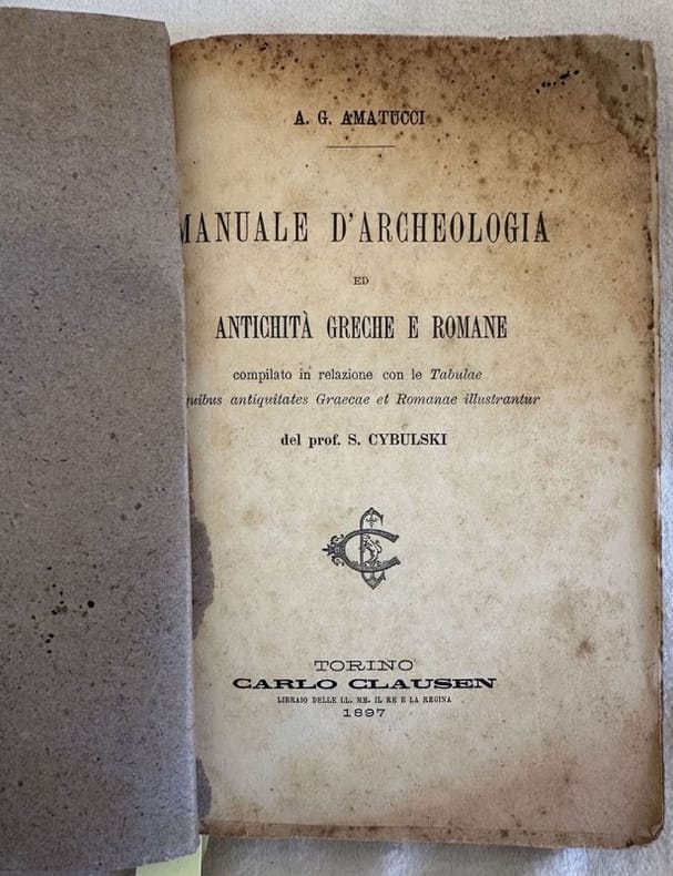 Edizione del 1897 di questo manuale di archeologia e antichità greche e romane scritto di A. G. Amatucci. Volume compilato in relazione con le Tabulae quibus antiquitates Graecae et Romanae illustrantur del prof. S. Cybulski. All'interno: Antichita private dei greci e dei romani (matrimonio, figli e loro educazione, schiavi, suppellettili domestica dei greci e dei Romani, La vita quotidiana, Vesti, Funerali e sepolcri); Antichità religiose (Templi e sacerdoti, sacrifizi e feste, palestra ginansio stadio, ippodromo); Antichità civili Magistrati in Grecia, Antichità militari (L'esercito, Armi greche e romane, I varii corpi di milizie, L'esercito in ordine di battaglia, Mura e porte, Disciplina militare). Alla fine due appendici: Scrittura libri e librerie, Acquedotti strade ponti viaggi alberghi e porte. In buone condizioni. Copertina morbida coeva in buone condizioni con lievi usure marginali. Legatura in buone condizioni. Pagine in buone condizioni con rare fioriture. In 8. 21x14 cm. Pp. X+(2)+310+(2).Edition of 1897 of this manual of archeology and roman and greek antiquities written by A. G. Amatucci. Volume written in relation with Tabulae quibus antiquitates Graecae et Romanae illustrantur by prof. S. Cybulski. In good conditions. Soft coeval cover in good conditions lgihtly worn in the extremities. Binding in good conditions. Inside pages are in good conditions with occasional foxing.In 8. 21x14 cm. Pp. X+(2)+310+(2).