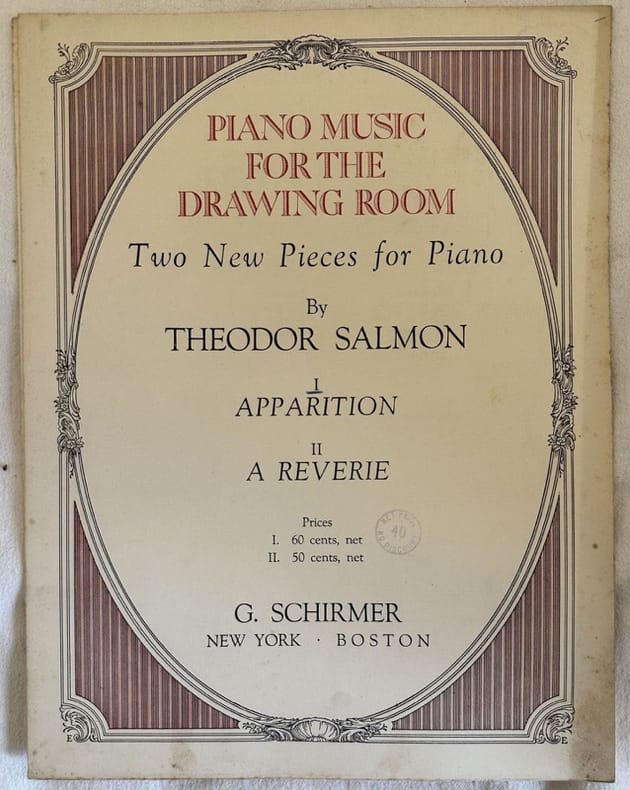 Edizione del 1918 di questa raccolta di due melodie "Apparition" e "A reverie" per pianoforte del pianista Theodor Salmon. In buone condizioni. Copertina editoriale in buone condizioni con lievi usure marginali. Legatura quasi assente. Pagine in buone condizioni con rare fioriture. In folio. cm. 30,5x23,5. Pp. 7, 6.Edition of late 1918 of this collection of two melodies "Apparition" and "A reverie" for piano by the piano player Theodor Salmon. In good conditions. Editorial cover in good conditions lightly worn in the extremities. Binding almost lacks. Pages in good conditions with occasional foxing. In folio. cm. 30,5x23,5. Pp. 7, 6.
