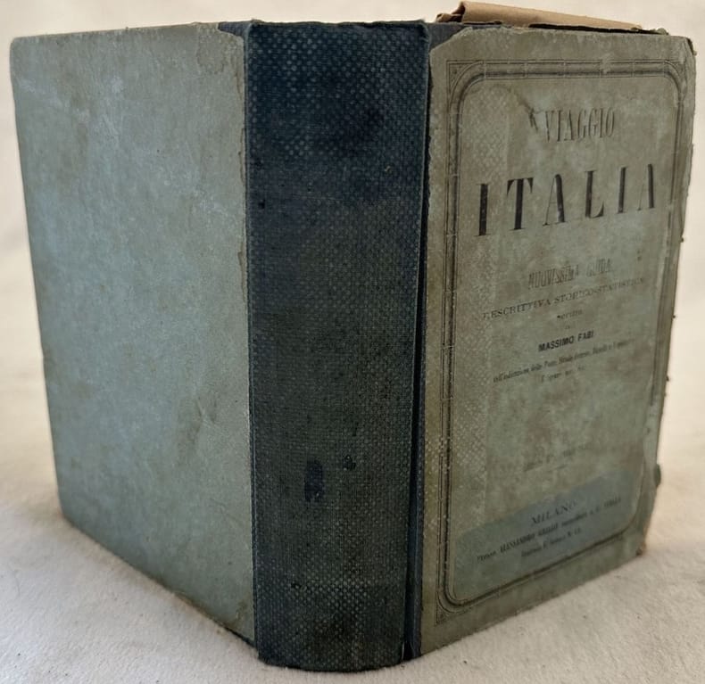 Interessante manuale di viaggio in Italia scritto da Massimo Fabi. Guida storico artistica dell'Italia intera con approfondimenti su Torino, Genova, Nizza, Ginevra, Piacenza, Parm, Modena, Bologna, Ancona, Milano, Pavia, Bergamo, Brescia, Verona, Vicenza, Padova, Venezia, Trieste, Treviso, Ferrara, Como, Trento, Mantova, Cremona, Ravenna, Perugia, Firenze, Livorno, Siena, Arezzo, Roma, Napoli. Sono presenti 32 vedute fuori testo tra cui: Torino, Cagliari, Genova, Monte Bianco, Monte Rosa, Piazza dei cavalli in Piacenza, Torre a Modena, Bologna, Milano, Certosa di Pavia, Venezia, Lago di Como, Firenze, Pisa battistero, Livorno, Porto Ferraio, Roma, Napoli, Ercolano, Sorrento, Palermo, Malta, Catania, Messina ec.. Mappa ripiegata dell'Italia in antiporta. In buone condizioni e completo. Copertina cartonata editoriale in buone condizioni generali con lievi usure ai margini e dorso. Legatura in discrete condizioni con lievi rotture. Pagine in buone condizioni con rare fioriture. In 16. cm 16,5x11. Pp. XV+(1)+639+(1)+32 tav.. Peso Kg. 0,400Interesting manual of travel in Italy written by Massimo Fabi. Historical artistic manual of Italy in particular about Torino, Genova, Nizza, Ginevra, Piacenza, Parm, Modena, Bologna, Ancona, Milano, Pavia, Bergamo, Brescia, Verona, Vicenza, Padova, Venezia, Trieste, Treviso, Ferrara, Como, Trento, Mantova, Cremona, Ravenna, Perugia, Firenze, Livorno, Siena, Arezzo, Roma, Napoli. There are 32 out of text plates as: Torino, Cagliari, Genova, Monte Bianco, Monte Rosa, Piazza dei cavalli in Piacenza, Torre a Modena, Bologna, Milano, Certosa di Pavia, Venezia, Lago di Como, Firenze, Pisa battistero, Livorno, Porto Ferraio, Roma, Napoli, Ercolano, Sorrento, Palermo, Malta, Catania, Messina ec.. Folded map of Italy in the frontspice. In good conditions and complete. Carton editorial cover in good conditions lightly worn in the extremities. Binding in fair conditions with light cracks. Pages in good conditions with occasional foxing. In 16. cm 16,5x11. Pp. XV+(1)+639+(1)+32 tav.. Peso Kg. 0,400