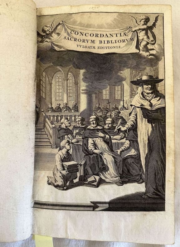 Bella edizione del 1684 di questa opera di concordanza biblica in forma di dizionario a cura di Lucas Franciscus (1548/49-1619). Testo latino. Antiche note manoscritte nel testo. Antiporta finemente incisa. Frontespizio in rosso e nero con vignetta che rappresenta Monogramma di cristo sostenuto da due angeli. In buone condizioni e completa. Copertina in piena pelle coeva con titolo e decorazioni in oro al dorso in discrete condizioni generali con usure ai margini e dorso. Lievi rotture alle cerniere. Legatura in discrete condizioni. Rottura alla carta Ll2 e Nn8. Pagine in buone condizioni con fioriture e lievi gore d'umdiità marginali. In 8. cm 21,5x13,5. Pp. (16)+1160. Peso KG. 1,400Beautiful edition of 1684 of this work of Bible concordance in form of dicitionary cared by Lucas Franciscus (1548/49-1619). Latin text. Antique handwritten notes in the text. Frontspice finely engraved. Red and black title page with vignette representing Monogram of Christ hold up by two angels. In good conditions and complete. Full leather coeval restored cover with gilted title and decorations in the spine in fair conditions with wearings in the extremities. light cracks in the hidges. Binding in fair conditions. Crack in the page Ll2 and Nn8. Pages in good conditions with foxing and light dump stains in the edges. In 8. cm 21,5x13,5. Pp. (16)+1160. Weight KG. 1,400