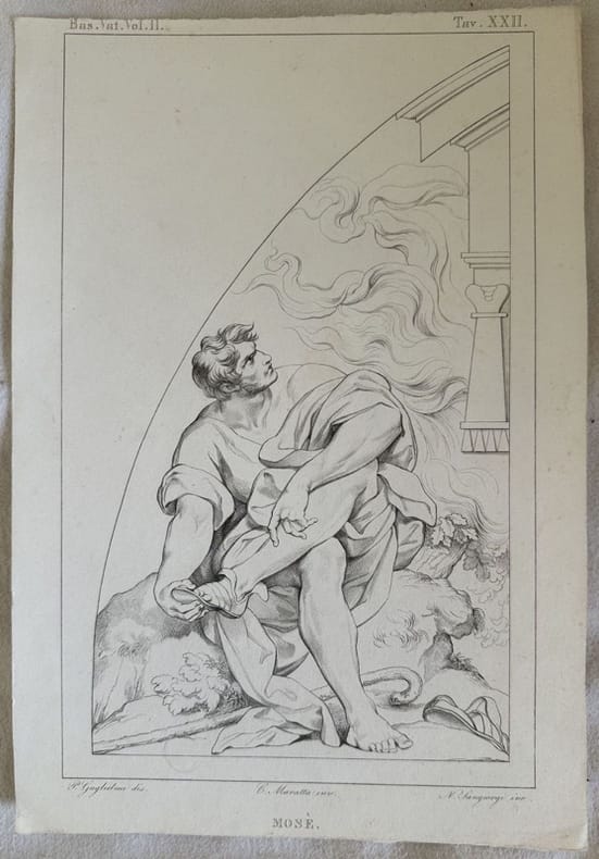 Incisione religiosa che rappresenta "Mosè" inciso da Nicola Sangiorgi (1844-1875) su disegno di P. Guglielmi. Autore: Nicola Sangiorgi (1844-1875) su disegno di P. Guglielmi. Data: 1860 circa Tecnica: acquafort Dimensione del foglio: 19x27,5 cm Dimensione dell'incisione: 15,5x25 cm Condizioni: Buone. Alcune fioriture. Religious engraving representing "Mosè" engraved by Nicola Sangiorgi (1844-1875) after di P. Guglielmi. Date: 1860 circa Author: Nicola Sangiorgi (1844-1875) after di P. Guglielmi Technique: etching Size of the page: 19x27,5 cm Size of the engraving: 15,5x25 cm Conditions: Good conditions. Some foxing. <BR><BR>