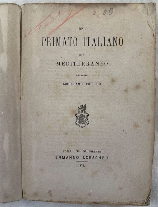 Edizione del 1872 di questo studio del Conte Luigi Campo Fregoso. L'autore esalta il primato italiano in diversi campi (geografico, intellettuale, politico, relgiioso, storico) e suggerisce di potenziare la presenza delle marinerie militari nel Mediterraneo. Note manoscritte a matia colorata. In discrete condizioni. Copertina morbida coeva in discrete condizioni con lievi usure marginali e mancanze. Legatura in discrete condizioni. Pagine in buone condizioni con rare fioriture. In 8. cm 20,5x14. Pp. XXVI+399. Edition of 1872 of this study by Luigi Campo Fregoso. The author underlines the italian superiority in different field and the need of its military presence in Mediterranean Sea. Handwritten notes with coloured pencil. In fair conditions. Soft coeval cover in fair conditions lightly worn with lackings in the extremities. Binding in fair conditions. Pages in good conditions with occasional foxing. In 8. cm 20,5x14. Pp. XXVI+399.