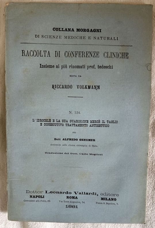 Interessante pubblicazione del 1881 sull'idrocele e la sua guarigione del Dottor Alfredo Genzmer. Traduzione del Dottor Carlo Maglieri. Fascicolo della Collana Morgagni di scienze mediche e naturali. Qualche illustrazione all'interno. In buone condizioni. Copertina editoriale in ottime condizioni generali con lievi usure ai margini e dorso. Legatura in buone condizioni. Pagine in ottime condizioni con rare fioriture. In 8. cm. 25x16,5. Pp. 1471-1533.Interesting pamphlet of 1881, about hydrocele and its healing by A. Schott. Translation by Dottor Carlo Maglieri. Pamphlet of Collana Morgagni of natural and medical science. Some illustration inside. In good conditions. Editorial cover in very good conditions lightly worn in the extremities. Binding in good conditions. Pages in very good conditions with occasional foxing. In 8. cm. 25x16,5. Pp. 1471-1533.