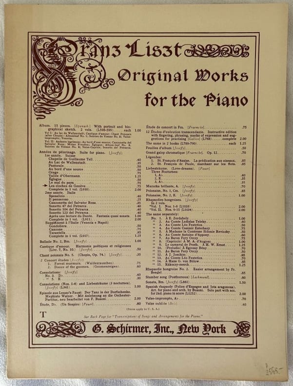 Edizione del 1909 della melodia "Les cloches de Geneve" dall'opera Annees de Pelerinage di Franz Liszt (1811-1886). Decorazioni in copertina. In ottime condizioni. Copertina editoriale in ottime condizioni con lievi usure marginali. Legatura in buone condizioni. Pagine in ottime condizioni con rare fioriture. In Folio. cm. 30,5x23. Pp. 7. Edition of 1909 of the melody "Les cloches de Geneve" from the work dall'opera Annees de Pelerinage by Franz Liszt (1811-1886). Decorations in the cover. In very good conditions. Editorial cover in very good conditions lightly worn in the extremities. Binding in good conditions. Pages in very good conditions with occasional foxing. In Folio. cm. 30,5x23. Pp. 7.