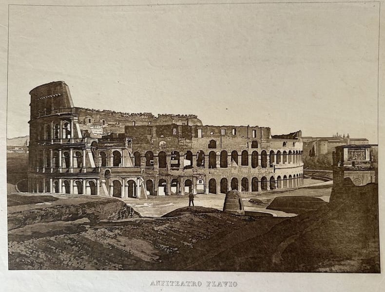 Veduta animata dell'anfiteatro Flavio. Data: 1850 circa Tecnica: acquatinta Dimensione del foglio: 330x260 mm Dimensione incisione: 270x195 cm Condizioni: Buone. Rare fioriture. Animated view of Flavio Amphitheatre. Date: 1850 circa Technique: acquatinct Leaf Dimension: 330x260 mm Engraving Dimension: 270x195 cm Conditions: Good conditions. Occasional foxing.