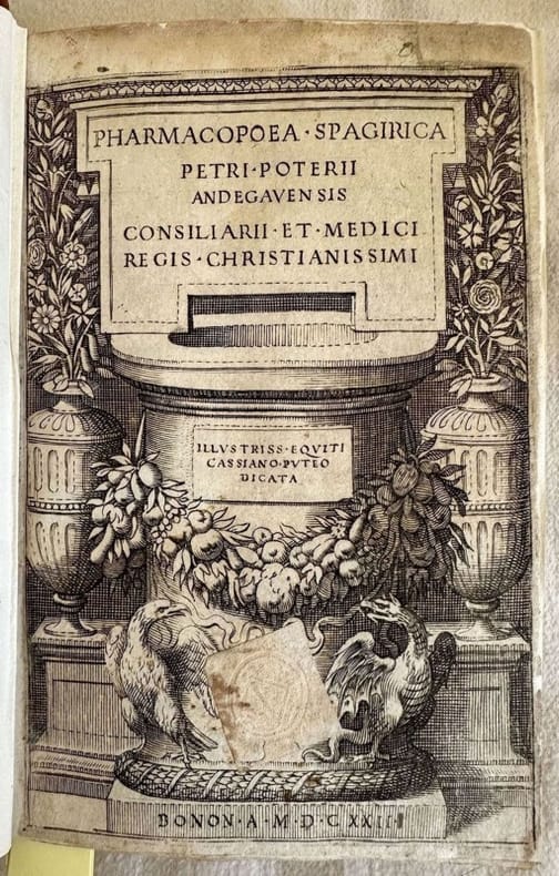 Prima edizione del 1622 di questa farmacopea spagirica scritta dal chimico e medico francese Pierre Potier (1581-...). Nato ad Angers si trasferì giovanissimo a Bologna dove lavorò per molti anni e annoverò tra i suoi pazienti e corrispondenti personaggi illustri quali Cassiano dal Pozzo e Nicolas Poussin. In occasione dell'epidemia di peste del 1630, di fronte al fallimento dei farmaci tradizionali, numerosi medici italiani cominciano a far ricorso a farmaci paracelsiani, come il tartaro, il mercurio, il vetriolo e l'antimonio. Potier utilizzava la medicina spagirica e tra le preparazioni di sua invenzioni era orgoglioso del suo "antihectum" (ossido di antimonio contenente latta). Fu inoltre uno dei primi a descrivere il metodo per la preparazione della pietra di Bologna. Morì assassinato da un collega geloso (Cfr. Eloy Nicolas Francois Joseph, Dictionnaire historique de la medecine ancienne et moderne 1778, T. 3, p. 615) Gui Patin, ortodosso galenista e sempre pronto a lanciale strali contro gli iatrochimici che insidiavan medicina tradizionale, gli riserva un corto paragrafo iin una delle sue lettere in occasione della pubblicazione postuma dell'Opera omnia "era un gran ciarlatano e furbone che si immischiava nelle cose del nostro mestiere" (Courtesy Wikipedia). Nel volume dettagliata descrizione delle modalità di preparazione dei farmaci e numerose ricette (decotto di agrimonio, antimonio, argento liquido, argento vivo, soluzione aurea, aqua di sterco di animale, di uomo, di vermi, di sperma di rama, di sangue umano, decotti vari, estratti, essenza delle erbe, estratto deglie scrementi degli animali, fermentazione, cose metallliche di Galeno, pietre solari e lunari, varie preparazioni con il mercurio, olio di iperico e alri tipi di olii, pillole spagiriche, preparazione e infusiuone del sole terrestre, sublimazione, sciroppo di viole, tinture varie, vitriolo, unicorno ec..). Frontespizio figurato. L'opera è in un volume ed è completa.<BR>In ottime condizioni. Copertina in piena pelle moderna in ottime condizioni generali. Legatura in ottime condizioni . All'interno le pagine si presentano in buone condizioni con fioriture per lo più marginali. Segno di restauro al frontespizio. In 16. Dim. 17,5x12 cm. Pp. (32)+280+(14)+126.First edition of 1622 of this spagyric pharmacopea written by the french chemistry and physician Pierre Potier (1581-...). Born in Angers he moved in Bologna when he was very young and he worked there for many years. Between his patients he had illustrious carachters as Cassiano dal Pozzo and Nicolas Poussin.<BR> In occasion of plague pest of 1630, after the failure of traditional medicines, different italian physicians began to use Paracelsus medicine as tartar, mercury, vetriolo and antimony. Potier used spagyrical medicine and invented many medicines as "antihectum" (antimony oxyde containing tin). He was one of the first to describe the method for the preparation of Bologna stone. He was killed by a jealous colleague (Cfr. Eloy Nicolas Francois Joseph, Dictionnaire historique de la medecine ancienne et moderne 1778, T. 3, p. 615)<BR> In the volume detailed description of preparations and different recipese (decotto di agrimonio, antimonio, argento liquido, argento vivo, soluzione aurea, aqua di sterco di animale, di uomo, di vermi, di sperma di rama, di sangue umano, decotti vari, estratti, essenza delle erbe, estratto deglie scrementi degli animali, fermentazione, cose metallliche di Galeno, pietre solari e lunari, varie preparazioni con il mercurio, olio di iperico e alri tipi di olii, pillole spagiriche, preparazione e infusiuone del sole terrestre, sublimazione, sciroppo di viole, tinture varie, vitriolo, unicorno ec..). Figurated title page. The work is in one volume and it is complete.<BR>In very good conditions. Modern leather cover in very good general conditions. Binding in very good conditions. Inside pages are in good conditions with foxing mostly on edges. Restauration in the title page. In 16. Dim. 17,5x12 cm. Pp. (32)+280+(14)+126.