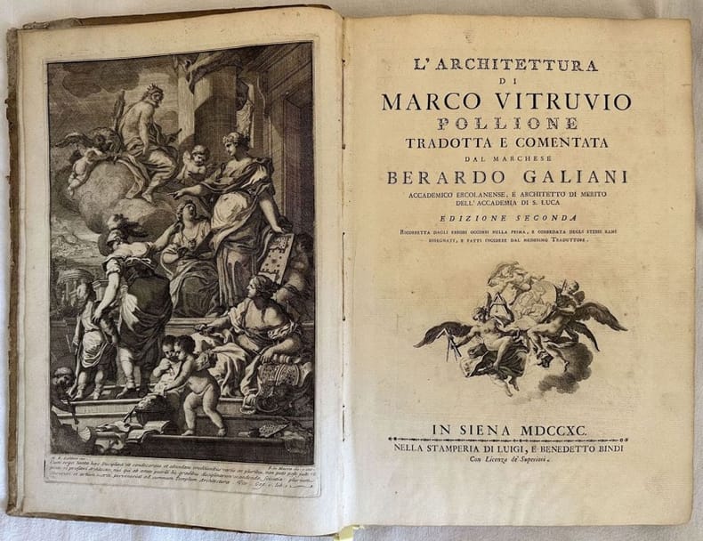 Seconda edizione illustrata del 1790 della traduzione del "De Architectura" di Vitruvio del marchese Berardo Galiani, e del relativo importante commento, fedelmente riproducente anche nei rami la prima, risalente al 1758. Cicognara, 735. Gamba, 2500 Finissima incisione in antiporta di F. La Marra su soggetto di Galiani. Alcune incisioni nel testo. Alla fine sono presenti venticinque tavole ripiegate: Piante di città e dei muri, Sfera dei venti e direzione di strade, Principi delle fabbriche e di divrse maniere, Proporzione del corpo umano, Ordini architettonici, Foro, Teatro romano e greco, Palestra, Casa romana, casa greca, Cortili, Acquedotti, macchine ec.. "Stimatissima e ricercatissima versione, sin a tanto che altri eruditi s'accinsero a nuovi studii su Vitruvio e a nuovi volgarizzamenti". Tagli marmorizzati In ottime condizioni. Copertina in mezza pergamena coeva con titolo manoscritto al dorso in buone condizioni generali con lievi usure ai margini e dorso. Legatura in buone condizioni . All'interno le pagine si presentano in ottime condizioni con rare fioriture. In folio. Dim. 38x26,5 cm. Pp. (4)+XX+272+XXV tavole.Second illustrated edition of 1790 of the translation by "De Architectura" of Vitruvio by Berardo Galiani, and relating important comment, faithfully reproducing the first one of 1758. Cicognara, 735. Gamba, 2500 Very fine engraving in the frontspice by F. La Marra after Galiani. Some engravings in the text. At the end there are 25 out of text folded plates: Piante di città e dei muri, Sfera dei venti e direzione di strade, Principi delle fabbriche e di divrse maniere, Proporzione del corpo umano, Ordini architettonici, Foro, Teatro romano e greco, Palestra, Casa romana, casa greca, Cortili, Acquedotti, macchine ec.. "Stimatissima e ricercatissima versione, sin a tanto che altri eruditi s'accinsero a nuovi studii su Vitruvio e a nuovi volgarizzamenti". Marbled external edges of pages In very good conditions. Half parchment coeval cover with handwritten title in the spine in good general conditions lightly worn i the extremities. Binding in good conditions. Inside pages are in very good conditions with occasional foxing. In folio. Dim. 38x26,5 cm. Pp. (4)+XX+272+XXV tavole.