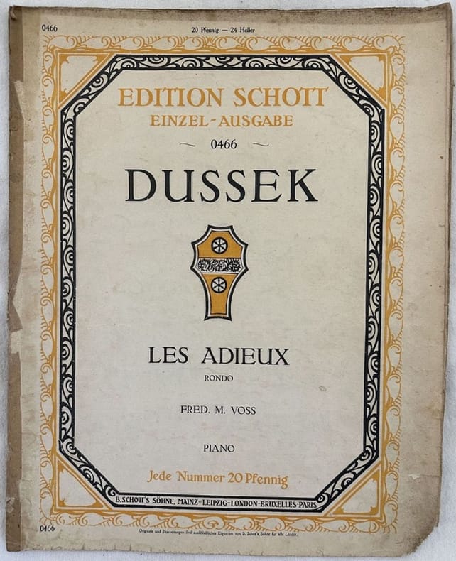 Edizione di inizio novecento della melodia per pianoforte "Les Adieux" del compositore ceco Jan Ladislav Dussek (1760-1812) . In discrete condizioni. Copertina editoriale in discrete condizioni con usure marginali e strappi. Angolo inferiore destro mancante. Dorso coperto da carta. Piatto in parte staccato. Legatura in buone condizioni. Pagine in buone condizioni con rare fioriture. In Folio. cm. 34x27. Pp. 9.Edition of early 20th century of this colelction of sonates for piano by the tzcheck composer Jan Ladislav Dussek (1760-1812) . In fair conditions. Editorial cover in fair conditions lightly worn in the extremities. Spine covered by paper and right lower corner missing. Plate partially detached. Binding in good conditions. Pages in good conditions with occasional foxing. In Folio. cm. 34x27. Pp. 9.