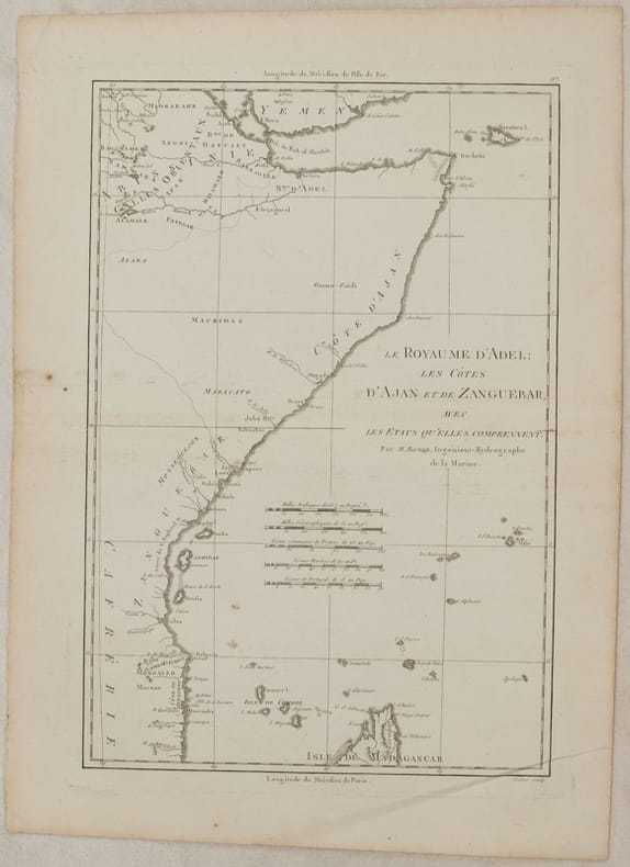 Mappa originale di Rigobert Bonne che mostra le coste del Regno di Ajan e Zanguebar (odierno Yemen, Etiopia, Kenya, Tanzania, Comoros, Mozambique). Bonne fu un influente cartografo francese della fine del XVIII secolo, un abile cartografo e idrografo e succedette a Jacques Nicolas Bellinc ome Idrografo Reale alla Depote la Marine nel 1773. AUTORE: Rigobert Bonne (1727-1755), André ATLANTE: Atlas encyclopedique contenant le geographie ancienne ey quelque cartees sur la geographie du moyen age, Paris, Hotel de Thou 1787 DATA: 1787 TECNICA: incisione su rame DIMENSIONI FOGLIO: 41x30,5 cm<BR>DIMENSIONI INCISIONE: 36,5x25 cm CONDIZIONI: ottime condizioni. Piegatura orizzontale. Lievi fioriture. Title: Le Royaume dAdel: les cotes dAjan et de Zanguebar avec les Etats quelles comprennent<BR><BR>Atlas: Atlas encyclopedique contenant le geographie ancienne ey quelque cartees sur la geographie du moyen age, Paris, Hotel de Thou 1787 Technique: Copper engraving Sheet size: 16.1x12 in; 41x30,5 cm Plate area: 14.4x9.8 in; 36,5x25. Overall condition: Excellent condition, with light foxing. Horizontal folding. Map by Rigobert Bonne featuring the coasts of the Reign of Ajan and Zanguebar (modern-day coasts of Yemen, Ethiopia, Kenya, Tanzania, Comoros, Mozambique). Bonne was an influential french cartographer of the late 18th century, was a skilled cartographer and hydrographer and succeded Jacques Nicolas Bellin as Royal Hydrographer at the Depote la Marine in 1773. Bonne is also important for the history of cartography because of the larger trends exemplified by his work. In Bonnes maps, it is possible to see the decisive shift from the elaborate decorations of the seventeenth century and the less ornate, yet still prominent embellishments of the early to mid-eighteenth century. By contrast, Bonnes work was simple, unadorned, and practical. This aesthetic shift, and the detail and precision of his geography, make Bonne an important figure in mapping history.