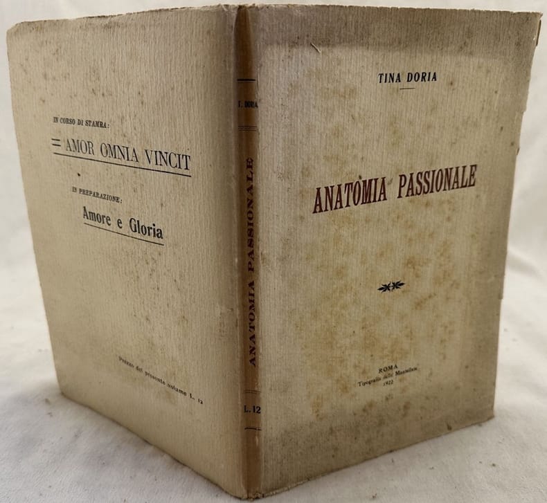 Interessante opera del 1922 sulla passione in vari campi scritta da Tina Doria. All'interno la passione nella giustizia (Il diritto di uccidere, colei che uccise, ùNell'ombra attendevano i sicari, Selvaggia, L'amore trionfa), Nelal vita.. (La passione del cieco, L'amore di Elsa, La passione di Giacomo, L'educanda vergognosa, La vocazione di Rita, Sorella di latte, L'amante della tedesca, L'illusione, Al tavolo verde, La signora maldicente ec..), Nel lavoro, nella fede nell'amore ec.. Firma originale dell'autrice che ne garantisce l'autenticità. In buone condizioni. Copertina editoriale in discrete condizioni generali con lievi usure ai margini e dorso. Legatura in buone condizioni. Pagine in buone condizioni con fioriture. In 8. cm 26x18. Pp. 190.Interesting work of 1922 about passion in different fields written by Tina Doria. Original signature of the author which guarantees authenticity of the book. in good conditions. Editorial cover in fair conditions lightly worn in the extremities. Binding in good conditions. Pages in good conditions with foxing. In 8. cm 26x18. Pp. 190.