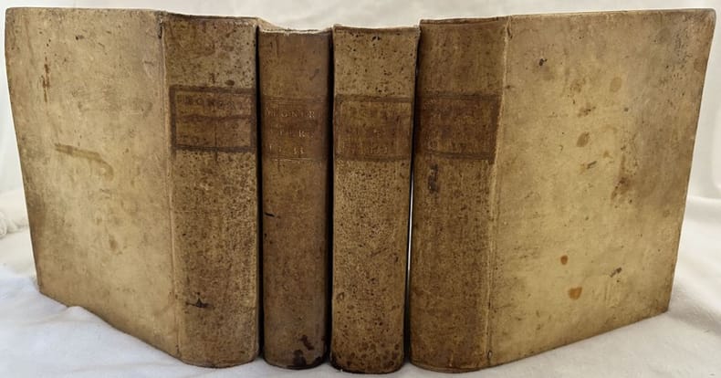 Edizione veneziana del 1773 di questa raccolta di opere di Paolo Segneri (1624-1694). L'opera è composta da quattro tomi ed è completa. All'interno le seguenti opere: Vita dell'autore, La Manna dell'anima, Meditazioni, Esposizione del Miserere, La pratica di stare interamente raccolto con Dio, I cinque venerdi di Santa Maria Maddalena de Pazzi, Quaresimale, Le Prediche dette nel Palazzo Apostolico, Panegirici Sacri, Il Cristiano istruito nella sua legge, L'incredulo senza scusa, La concordia tra la Fatica e la quiete, La lettera di risposta, I sette principi, Fascetto di vari dubbi, Il Divoto di Maria vergine, Il Parroco Istruito, Il Confessore istruito, Il penitente istruito, Il penitente istruito a ben confessarsi, LAude Spirituale, Il Magnificat, Lettere su la materia del probabile. Nell'opera "L'incredulo senza scusa" dimostra la vera religione cristiana e nelle sue dissertazioni parla anche dell'astrologia, l'immortalità dell'anima, i miracoli, gli ebrei, eretici, le sette, le profezie.<BR><BR>Ritratto di Segneri inciso da Geronimo Rossi alla carta 8 n.n.. Bei capilettera disegnati. Tagli marmorizzati. Antiche note manoscritte. In buone condizioni. Copertina in piena pergamena coeva in buone condizioni generali con lievi usure ai margini e dorso. Legatura in buone condizioni. Pagine in buone condizioni con fioriture. Gore d'umidità nei tomi 2, 3,4 in particolare nel volume terzo che presenta anche una brunitura al margine inferiore. In 8. cm 24x18,5. Pp. (8)+798, (12)+672, (6)+295+(1)+216+382, (8)+854. Peso Kg. 5.Venetian edition of 1773 of this collection of works by Paolo Segneri (1624-1694).The work is made up of four tomes and it is complete. Insdie the following works: Life of the author, La Manna dell'anima, Meditazioni, Esposizione del Miserere, La pratica di stare interamente raccolto con Dio, I cinque venerdi di Santa Maria Maddalena de Pazzi, Quaresimale, Le Prediche dette nel Palazzo Apostolico, Panegirici Sacri, Il Cristiano istruito nella sua legge, L'incredulo senza scusa, La concordia tra la Fatica e la quiete, La lettera di risposta, I sette principi, Fascetto di vari dubbi, Il Divoto di Maria vergine, Il Parroco Istruito, Il Confessore istruito, Il penitente istruito, Il penitente istruito a ben confessarsi, LAude Spirituale, Il Magnificat, Lettere su la materia del probabile. Portrait of Segneri engraved by Geronimo Rossi in page 8 n.n.. Beautiful decorated capital letters. External marbled edges. Antique handwritten notes. In good conditions. Parchment coeval cover in good conditions lightly worn in the extremities. Binding in good conditions. Pages in good conditions with foxing. Dump stains in tome 2, 3,4 in particular in third volume which has a yellowing in the foot edge. In 8. cm 24x18,5. Pp. (8)+798, (12)+672, (6)+295+(1)+216+382, (8)+854. Weight Kg. 5.
