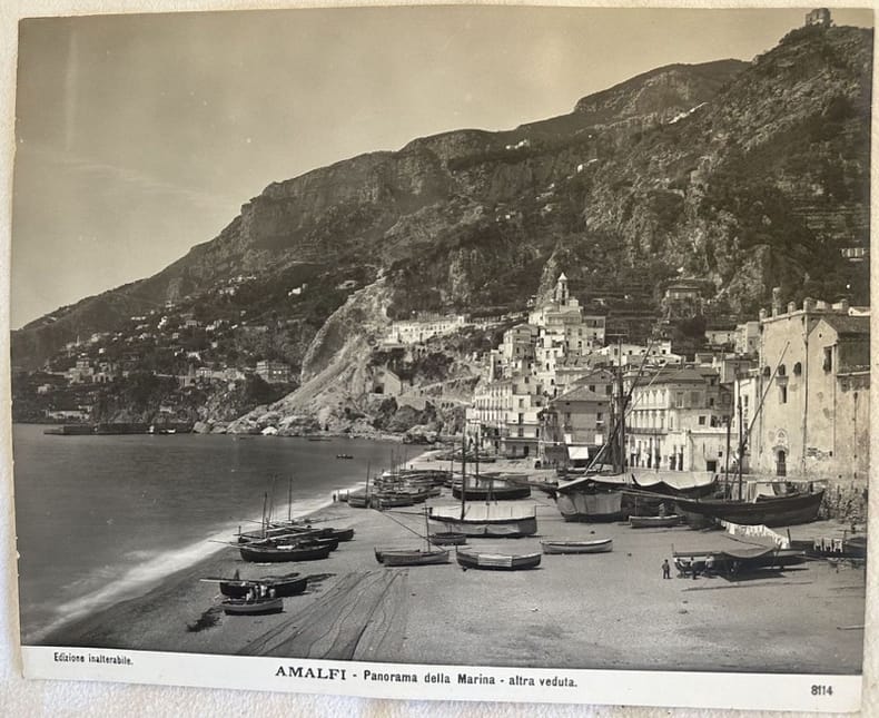 Bellissima foto in bianco e nero della fine dell'ottocento o inizi del novecento che mostra una veduta animata di Amalfi. In buone condizioni. cm. 19,5x24. Pp. 31.Very beautiful black and white photoes of late 19th century or early 20th century showing an animated view of Amalfi. In good conditions. In 4. cm. 19,5x24. Pp. 31.<BR><BR>