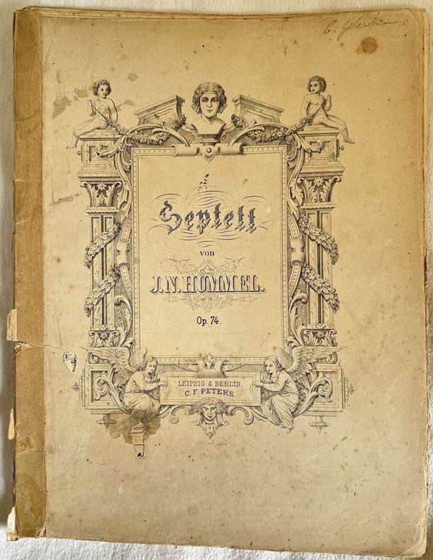 Edizione della fine dell'ottocento della melodia per per due pianoforti "Septett" dall'opera 74 di Johann Nepomuk Hummel (1778-1837) compositore direttore d'orchestra e pianista austriaco. Decorazioni in copertina. In discrete condizioni. Copertina editoriale in discrete condizioni con lievi usure marginali. Piatti staccati. Legatura editorialmente assente. Pagine in buone condizioni con fioriture. In Folio. cm. 34,5x27,5. Pp. 59<BR>Edition of late 19th century of the melody for two pianos "Septett" from the opera 74 by Johann Nepomuk Hummel (1778-1837) composer director of orchestra and piano player. Decorations in the cover. In fair conditions. Editorial cover in fair conditions lightly worn in the extremities. Plates detached. Binding editoriarly lacks. Pages in good conditions with foxing. In Folio. cm. 34,5x27,5. Pp. 59<BR>