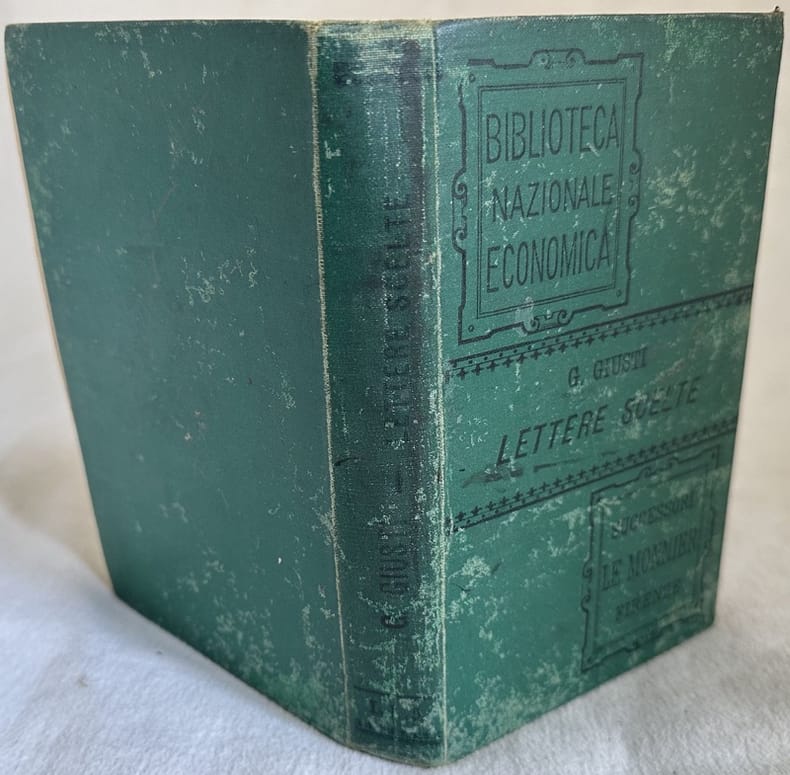 Edizione Le Monnier del 1891 della serie "Biblioteca nazionale economica" di questa raccolta di lettere tratte dall'epistolario di Giuseppe Giusti (1809-1850) con note di Giuseppe Rigutini. Il suo celebre epistolario venne pubblicato postumo alla sua morte, nel 1859. Giovanni Frassi raccolse tutta la corrispondenza del poeta italiano dal 1836 sino alla sua morte nel 1850.<BR><BR>All'inizio la vita dell'autore. Copertina in tela editoriale verde. Copertina in tela editoriale in discrete condizioni generali con lievi usure ai margini e dorso e parti scolorite (vedere foto). Legatura in mediocri condizioni. Corpo del libro staccato dalla copertina e qualche pagina staccata. All'interno le pagine si presentano in buone condizioni con rare fioriture. In 16. Dim. 17,5x11,5 cm. Pp. (4)+420.Le Monnier edition of 1891 of the series "Biblioteca nazionale economica" of this collection of letters taken from the epistolary of Giuseppe Giusti (1809-1850) with notes by Giuseppe Rigutini. His famous epistolary was published posthumous to his death, in 1859. Giovanni Frassi collected all the correspondance of the italian poet from 1836 until his death in 1850.<BR><BR>At the beginning the life of the author. Cloth editorial green cover. Cloth editorial cover in fair general conditions slightly worn in the edges and spine and with dicoloured parts. Binding in poor conditions. The body of the book detached from the cover and some page detached. Inside pages are in good conditions with occasional foxing. In 16. Dim. 17,5x11,5 cm. Pp. (4)+420.