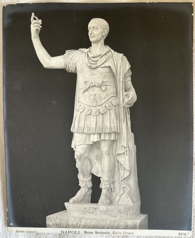 Bellissima foto in bianco e nero della fine dell'ottocento o inizi del novecento che mostra una statua antica "Giulio Cesare" presente nel Museo Nazionale di Napoli. In buone condizioni cm. 24x19,5. Very beautiful black and white photo of late 19th century or early 20th century showing an antique statue "Giulio Cesare" in the Museo Nazionale di Napoli. In good conditions cm. 24x19,5