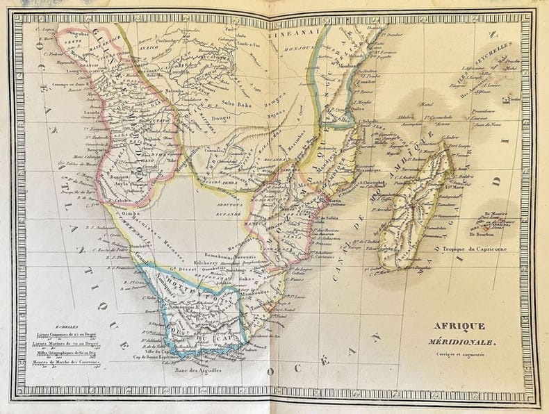 Mappa colorata del 1860 circa dell'Africa del Sud. Indicazione del Capo di Buona Speranza TECNICA: acquaforte su rame DIMENSIONI FOGLIO: 28,5x40,5 cm DIMENSIONI INCISIONE: 26,5x35,5 cm EPOCA: 1860 circa CONDIZIONI: buone condizioni. Gora d'umidità al margine superioreColored map of South Africa of 1860 circa. Indication of Cape of Good Hope. Date: 1860 circa Technique: etching on copper Leaf Dimension: 28,5x40,5 cm (11.2x15.9 inches) Engraving Dimension: 26,5x35,5 cm (10.4x14 inches) Conditions: Good conditions. Dump stain in the upper edge