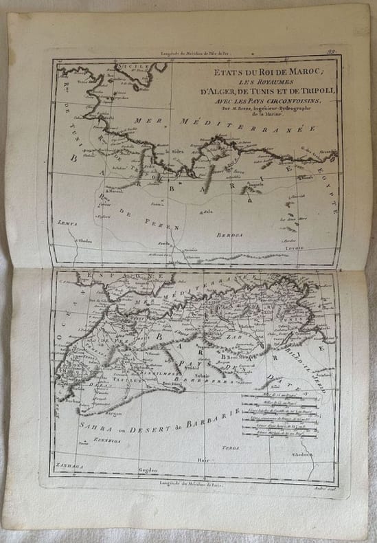 Mappa del 1780 circa del nord Africa (odierno Marocco, Algeria, Tunisia, Libia) di Rigobert Bonne.<BR> AUTORE: Rigobert Bonne (1727-1755), André TECNICA: acquaforte su acciaio DIMENSIONI FOGLIO: 42x29 cm DIMENSIONI INCISIONE: 36x24,5 cm EPOCA: 1780 circa CONDIZIONI: buone condizioni. Piegatura orizzontale. Nice map by Rigobert Bonne featuring North Africa countries (modern-day Morocco, Algeria, Tunisia, Lybia). Author: Rigobert Bonne (1727-1755), André Date: 1780 circa Technique: etching on steelLeaf Dimension: 42x29 cm Engraving Dimension: 36x24,5 cm Conditions: Good conditions. Horizontal foldings.<BR><BR>