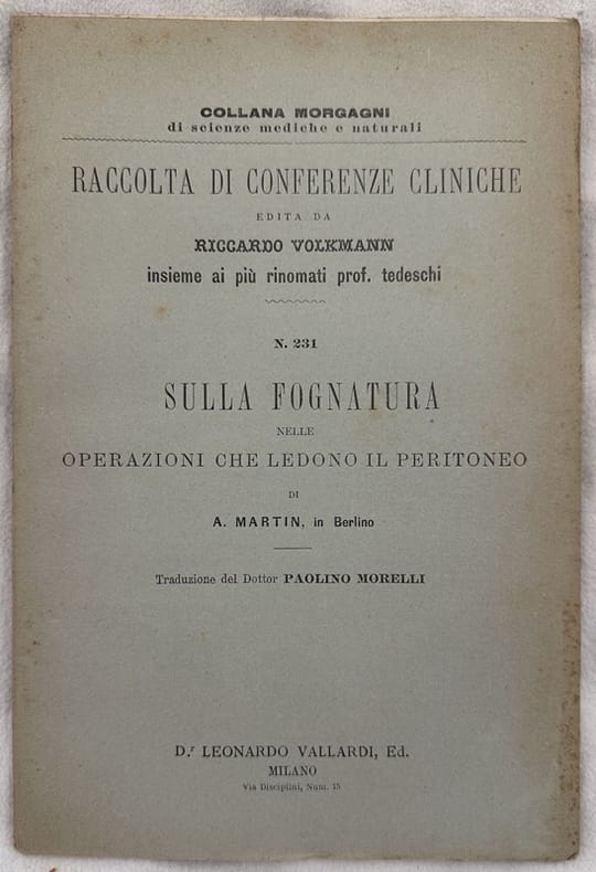 Interessante pubblicazione del 1880 circa sulla fognatura nelle operazioni che ledono il peritoneo di A. Martin. Traduzione del Dottor Paolino Morelli. Fascicolo della Collana Morgagni di scienze mediche e naturali. In buone condizioni. Copertina editoriale in ottime condizioni generali con lievi usure ai margini e dorso. Legatura in buone condizioni. Pagine in ottime condizioni con rare fioriture. In 8. cm. 24,5x16,5. Pp. 2075-2096.Interesting pamphlet of 1880 circa, about surgery of peritoneum by A. Martin. Translation by Dottor Paolino Morelli. Pamphlet of Collana Morgagni of natural and medical science. In good conditions Editorial cover in very good conditions lightly worn in the extremities. Binding in good conditions. Pages in very good conditions with occasional foxing. In 8. cm. 24,5x16,5. Pp. 2075-2096.