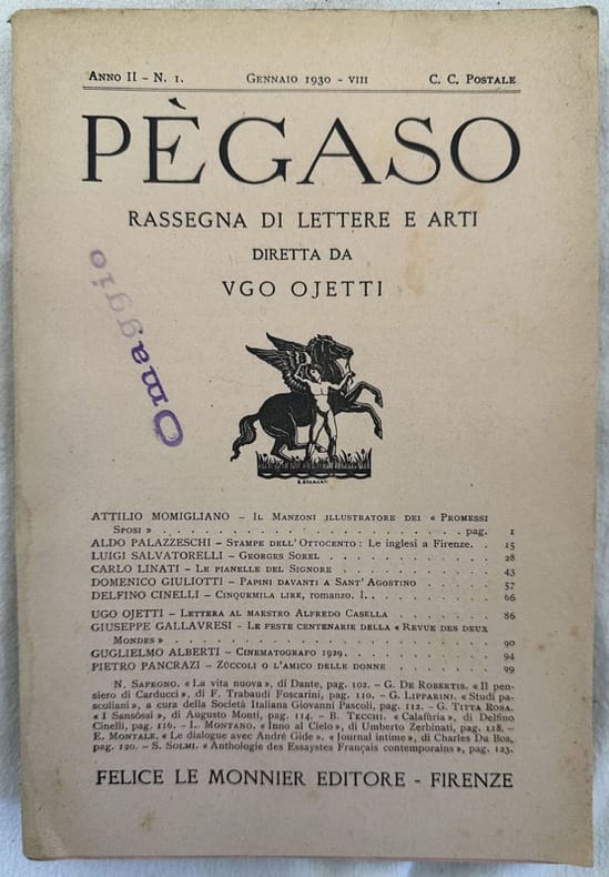 Numero del gennaio 1930 di questa importante rivista culturale pubblicata tra il 1929 ed il 1933 diretta da Ugo Ojetti. Alla rivista collaborarono importanti personalità dell'epoca, vennero pubblicate numerose opere in prima edizione e scritti inediti del Tommaseo, Manzoni ecc... All'interno: Il Manzone illustratore dei Promessi PSosi (Momigliano), Stampe dell'ottocento le inglesi a Firenze (Palazzeschi), Georges Sorel (Salvatorelli), Le pianelle del Signore (Linati), Papini davanti a Sant'Agostino (Giuliotti), Cinquemila lire (Cinelli), Lettera al Maestro Alfredo Casella (Ojetti), Le feste centenarie della "Revue des deux mondes" (Gallavresi), Cinematografo 1929 (Alberti), Zuccoli o l'amico delle donne (Pancrazi). In buone condizion. Brossura editoriale in buone condizioni generali con lievi usure ai margini e dorso. Legatura in buone condizioni. Pagine in ottime condizioni con rare fioriture. In 8. cm 24,5x16,5. Pp. (18)+128. Number of january 1930 of this important cultural review published between 1929 and 1933 directed by Ugo Ojetti. To the magazine many important personalities collaborated, different works in first edition were published and among them inedit writings of Tommaseo, Manzoni etc... All'interno: Il Manzone illustratore dei Promessi PSosi (Momigliano), Stampe dell'ottocento le inglesi a Firenze (Palazzeschi), Georges Sorel (Salvatorelli), Le pianelle del Signore (Linati), Papini davanti a Sant'Agostino (Giuliotti), Cinquemila lire (Cinelli), Lettera al Maestro Alfredo Casella (Ojetti), Le feste centenarie della "Revue des deux mondes" (Gallavresi), Cinematografo 1929 (Alberti), Zuccoli o l'amico delle donne (Pancrazi). In good conditions. Editorial cover in good general conditions lightly worn in the extremities. Binding in good conditions. Pages in very good conditions with occasional foxing.In 8. cm 24,5x16,5. Pp. (18)+128.