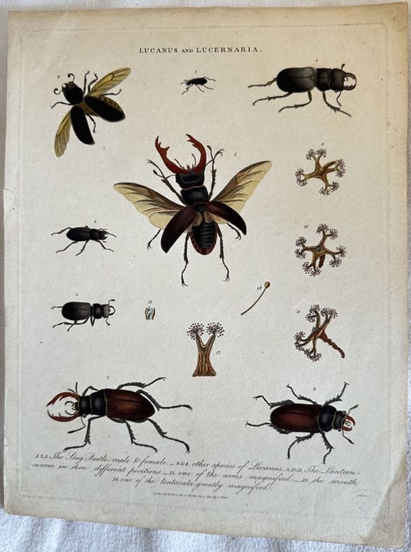 Xilografia di entomologia del 1815 colorata a mano. La stampa rappresenta diverse specie della famiglia Lucanus tra cui il cefvo volante e della famiglia delle Lucernaria. Autore: J. Pais Data: 1815 Tecnica: xilografia colorata a mano Dimensione del foglio: 288x220 mm Dimensione incisione: 265x205 mm Condizioni: Buone. Alcune fioriture. Nice woodcut of entomology of 1815 coloured by hand. The print represents different species of Family Lucanus as flying deer and of the family of Lucernaria. Author: J. Pais Date: 1815 Technique: xilography coloured by hand Size of the page: 288x220 mm Size of the engraving: 265x205 mm Conditions: Good conditions. Some foxing