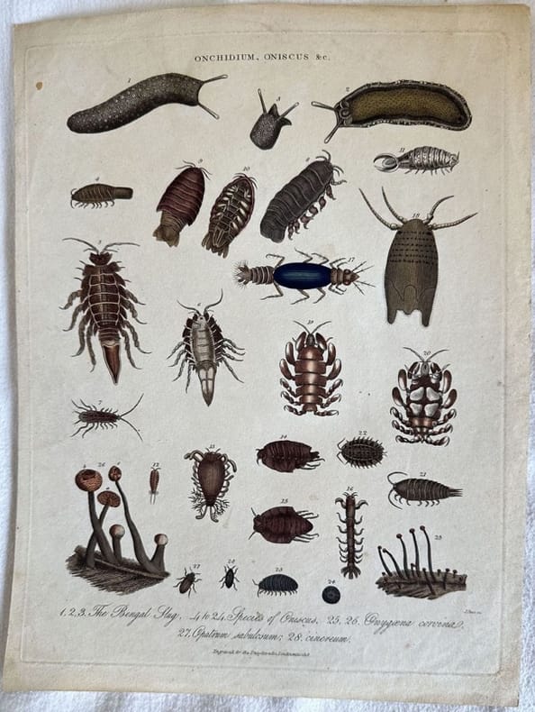 Xilografia di entomologia del 1815 colorata a mano. La stampa rappresenta diverse specie della famiglia Onchidium e Oniscus. Autore: John Pass (1783?-1832) Data: 1819 Tecnica: xilografia colorata a mano Dimensione del foglio: 285x215 mm Dimensione incisione: 260x200 mm Nice woodcut of entomology of 1819 coloured by hand. The print represents different species of Family Onchidium and Oniscus. Author: John Pass (1783?-1832) Date: 1819 Technique: xilography coloured by hand Size of the page: 285x215 mm Size of the engraving: 260x200 mm Conditions: Good conditions. Some foxing<BR>Condizioni: Buone. Alcune fioriture