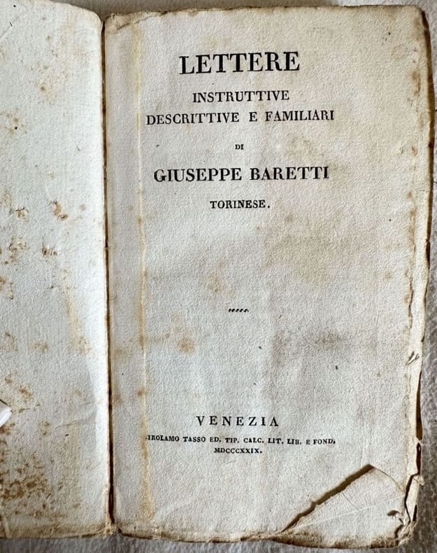 Edizione del 1829 di questa raccolta di lettere istruttive descrittive e familari dello scrittore e critico italiano Giuseppe Baretti (1719-1789). All'inizio notizie sulla vita e opere di Baretti. Seguono le lettere istruttive (della lingua italiana;della corrotta lingua che si parla ne vari stati di Italia; De lalingua che si scrive in Italia debbasi chiamare fiorentina, toscana o italiana); seguono le lettere di viaggio (Ispagna; La festa de tori in Lisbona, Il terremoto in Lisbona, La fiera e i balli d'Elvas, Il coregidor di Talavera, Divertimento di Meaxaras) ecc... In buone condizioni. Copertina morbida coeva con titolo manoscritto al dorso in buone condizioni generali con lievi usure ai margini e dorso. Legatura in buone condizioni. Pagine in buone condizioni con fioriture. In 16. Cm 14,5x8,5. Pp. 202.Edition of 1829 of this collection of educational descriptive and family letters by the italian writer and critic Giuseppe Baretti (1719-1789). At the beginning information about the life of Baretti. The educational letters about italian lòanguage and italian dialects, letters of travel (Ispagna; La festa de tori in Lisbona, Il terremoto in Lisbona, La fiera e i balli d'Elvas, Il coregidor di Talavera, Divertimento di Meaxaras) ecc... In good condition. Soft coeval cover with handwritten title in the spine in good general conditions lightly worn in the extremities. Binding in good conditions. Pages in good conditions with foxing. In 16. Cm 14,5x8,5. Pp. 202.<BR><BR>